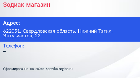 Зодиак, магазин по адресу 622051, Свердловская область, Нижний Тагил, Энтузиастов, 22 в дальнейшем Организация, размещена в следующих категориях: