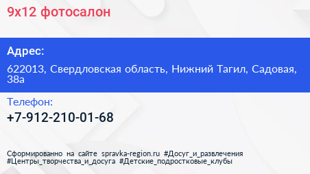 9x12, фотосалон по адресу 622013, Свердловская область, Нижний Тагил, Садовая, 38а в дальнейшем Организация, размещена в следующих категориях: