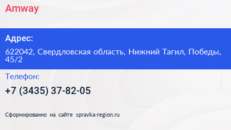 Amway по адресу 622042, Свердловская область, Нижний Тагил, Победы, 45/2 в дальнейшем Организация, размещена в следующих категориях: