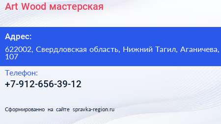 Art.Wood, мастерская по адресу 622002, Свердловская область, Нижний Тагил, Аганичева, 107 в дальнейшем Организация, размещена в следующих категориях: