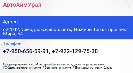 АвтоХимУрал по адресу 622042, Свердловская область, Нижний Тагил, проспект Мира, 64 в дальнейшем Организация, размещена в следующих категориях: