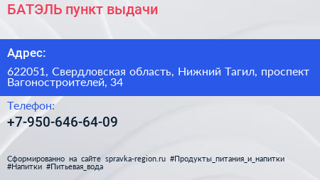 БАТЭЛЬ, пункт выдачи по адресу 622051, Свердловская область, Нижний Тагил, проспект Вагоностроителей, 34 в дальнейшем Организация, размещена в следующих категориях: