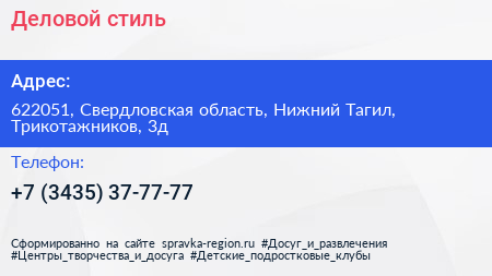 Деловой стиль по адресу 622051, Свердловская область, Нижний Тагил, Трикотажников, 3д в дальнейшем Организация, размещена в следующих категориях: