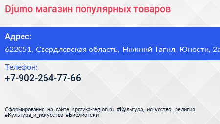 Djumo, магазин популярных товаров по адресу 622051, Свердловская область, Нижний Тагил, Юности, 2а в дальнейшем Организация, размещена в следующих категориях: