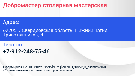 Добромастер, столярная мастерская по адресу 622051, Свердловская область, Нижний Тагил, Трикотажников, 4 в дальнейшем Организация, размещена в следующих категориях: