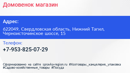 Домовенок, магазин по адресу 622049, Свердловская область, Нижний Тагил, Черноисточинское шоссе, 15 в дальнейшем Организация, размещена в следующих категориях: