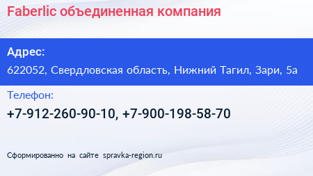 Faberlic, объединенная компания по адресу 622052, Свердловская область, Нижний Тагил, Зари, 5а в дальнейшем Организация, размещена в следующих категориях: