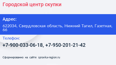 Городской центр скупки по адресу 622034, Свердловская область, Нижний Тагил, Газетная, 66 в дальнейшем Организация, размещена в следующих категориях: