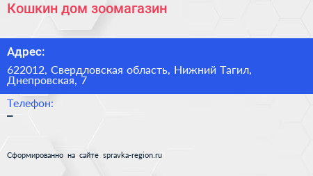 Кошкин дом, зоомагазин по адресу 622012, Свердловская область, Нижний Тагил, Днепровская, 7 в дальнейшем Организация, размещена в следующих категориях: