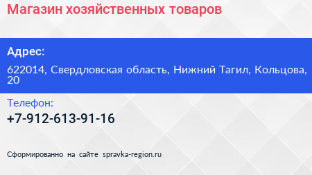 Магазин хозяйственных товаров по адресу 622014, Свердловская область, Нижний Тагил, Кольцова, 20 в дальнейшем Организация, размещена в следующих категориях: