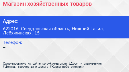Магазин хозяйственных товаров по адресу 622016, Свердловская область, Нижний Тагил, Лебяжинская, 15 в дальнейшем Организация, размещена в следующих категориях: