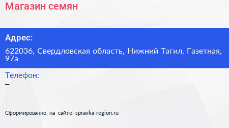 Магазин семян по адресу 622036, Свердловская область, Нижний Тагил, Газетная, 97а в дальнейшем Организация, размещена в следующих категориях: