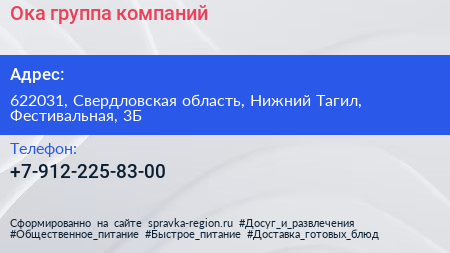 Ока, группа компаний по адресу 622031, Свердловская область, Нижний Тагил, Фестивальная, 3Б в дальнейшем Организация, размещена в следующих категориях: