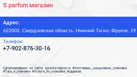 S-parfum, магазин по адресу 622002, Свердловская область, Нижний Тагил, Фрунзе, 19 в дальнейшем Организация, размещена в следующих категориях: