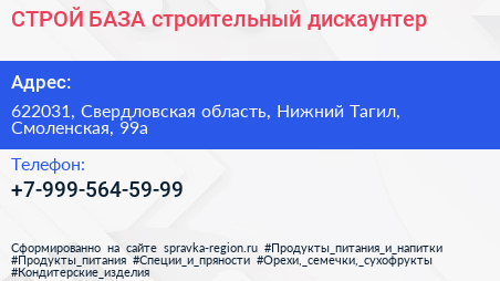 СТРОЙ БАЗА, строительный дискаунтер по адресу 622031, Свердловская область, Нижний Тагил, Смоленская, 99а в дальнейшем Организация, размещена в следующих категориях: