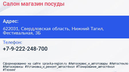 Салон-магазин посуды по адресу 622031, Свердловская область, Нижний Тагил, Фестивальная, 3Б в дальнейшем Организация, размещена в следующих категориях: