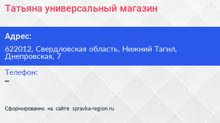 Татьяна, универсальный магазин по адресу 622012, Свердловская область, Нижний Тагил, Днепровская, 7 в дальнейшем Организация, размещена в следующих категориях: