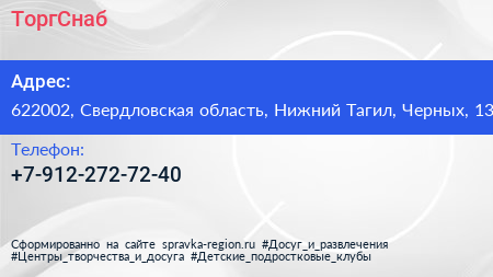 ТоргСнаб по адресу 622002, Свердловская область, Нижний Тагил, Черных, 13 в дальнейшем Организация, размещена в следующих категориях:
