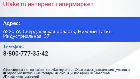 Utake.ru, интернет-гипермаркет по адресу 622059, Свердловская область, Нижний Тагил, Индустриальная, 37 в дальнейшем Организация, размещена в следующих категориях: