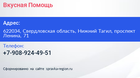 Вкусная Помощь по адресу 622034, Свердловская область, Нижний Тагил, проспект Ленина, 71 в дальнейшем Организация, размещена в следующих категориях: