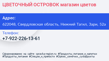 ЦВЕТОЧНЫЙ ОСТРОВОК, магазин цветов по адресу 622048, Свердловская область, Нижний Тагил, Зари, 52а в дальнейшем Организация, размещена в следующих категориях: