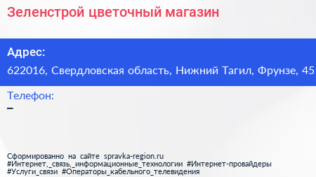 Зеленстрой, цветочный магазин по адресу 622016, Свердловская область, Нижний Тагил, Фрунзе, 45 в дальнейшем Организация, размещена в следующих категориях: