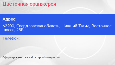 Цветочная оранжерея по адресу 62200, Свердловская область, Нижний Тагил, Восточное шоссе, 25Б в дальнейшем Организация, размещена в следующих категориях: