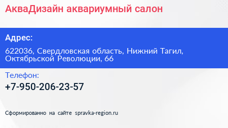 АкваДизайн, аквариумный салон по адресу 622036, Свердловская область, Нижний Тагил, Октябрьской Революции, 66 в дальнейшем Организация, размещена в следующих категориях: