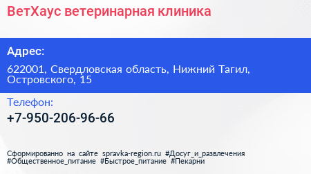 ВетХаус, ветеринарная клиника по адресу 622001, Свердловская область, Нижний Тагил, Островского, 15 в дальнейшем Организация, размещена в следующих категориях: