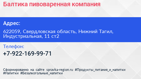 Балтика, пивоваренная компания по адресу 622059, Свердловская область, Нижний Тагил, Индустриальная, 11 ст2 в дальнейшем Организация, размещена в следующих категориях: