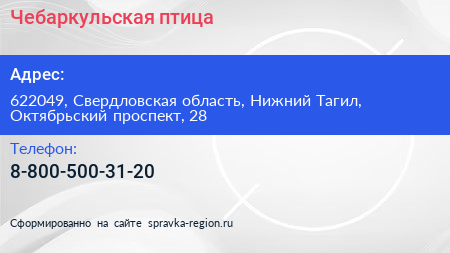 Чебаркульская птица по адресу 622049, Свердловская область, Нижний Тагил, Октябрьский проспект, 28 в дальнейшем Организация, размещена в следующих категориях: