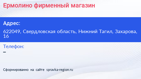 Ермолино, фирменный магазин по адресу 622049, Свердловская область, Нижний Тагил, Захарова, 16 в дальнейшем Организация, размещена в следующих категориях: