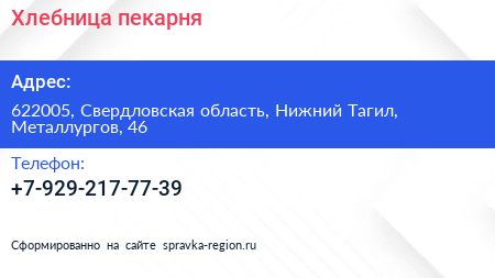 Хлебница, пекарня по адресу 622005, Свердловская область, Нижний Тагил, Металлургов, 46 в дальнейшем Организация, размещена в следующих категориях: