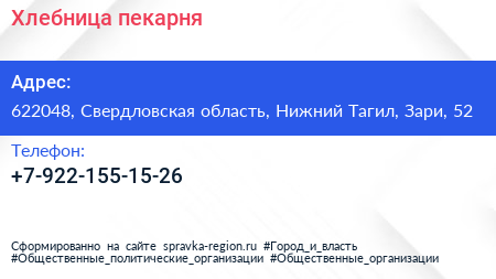 Хлебница, пекарня по адресу 622048, Свердловская область, Нижний Тагил, Зари, 52 в дальнейшем Организация, размещена в следующих категориях:
