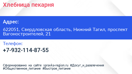 Хлебница, пекарня по адресу 622051, Свердловская область, Нижний Тагил, проспект Вагоностроителей, 21 в дальнейшем Организация, размещена в следующих категориях:
