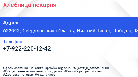 Хлебница, пекарня по адресу 622042, Свердловская область, Нижний Тагил, Победы, 43 в дальнейшем Организация, размещена в следующих категориях: