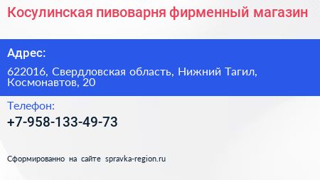 Косулинская пивоварня, фирменный магазин по адресу 622016, Свердловская область, Нижний Тагил, Космонавтов, 20 в дальнейшем Организация, размещена в следующих категориях:
