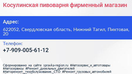 Косулинская пивоварня, фирменный магазин по адресу 622052, Свердловская область, Нижний Тагил, Пихтовая, 20 в дальнейшем Организация, размещена в следующих категориях: