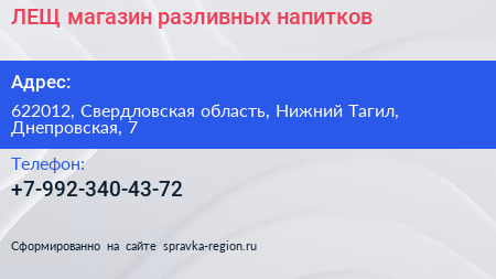 ЛЕЩ, магазин разливных напитков по адресу 622012, Свердловская область, Нижний Тагил, Днепровская, 7 в дальнейшем Организация, размещена в следующих категориях: