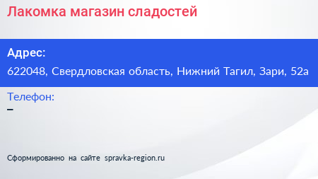 Лакомка, магазин сладостей по адресу 622048, Свердловская область, Нижний Тагил, Зари, 52а в дальнейшем Организация, размещена в следующих категориях: