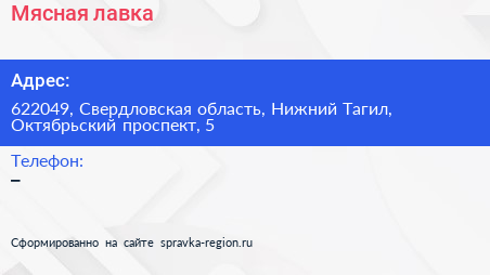 Мясная лавка по адресу 622049, Свердловская область, Нижний Тагил, Октябрьский проспект, 5 в дальнейшем Организация, размещена в следующих категориях: