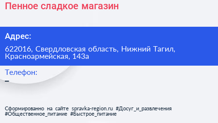 Пенное сладкое, магазин по адресу 622016, Свердловская область, Нижний Тагил, Красноармейская, 143а в дальнейшем Организация, размещена в следующих категориях: