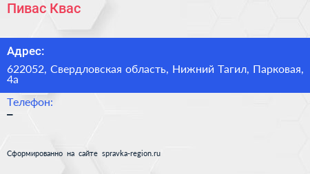 Пивас & Квас по адресу 622052, Свердловская область, Нижний Тагил, Парковая, 4а в дальнейшем Организация, размещена в следующих категориях: