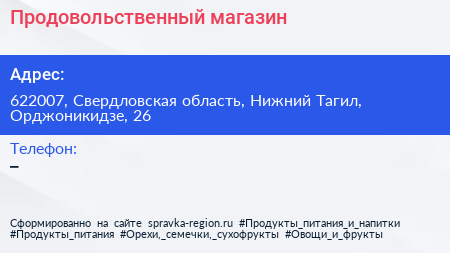 Продовольственный магазин по адресу 622007, Свердловская область, Нижний Тагил, Орджоникидзе, 26 в дальнейшем Организация, размещена в следующих категориях:
