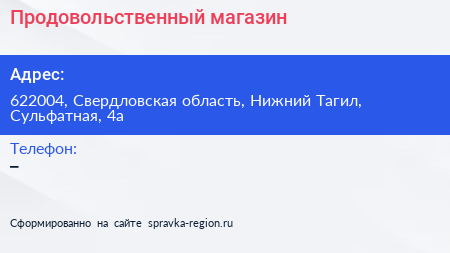 Продовольственный магазин по адресу 622004, Свердловская область, Нижний Тагил, Сульфатная, 4а в дальнейшем Организация, размещена в следующих категориях: