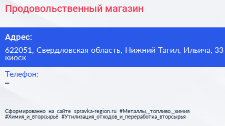 Продовольственный магазин по адресу 622051, Свердловская область, Нижний Тагил, Ильича, 33 киоск в дальнейшем Организация, размещена в следующих категориях: