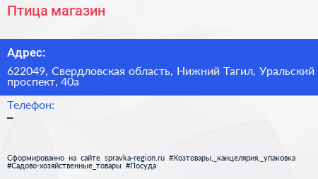 Птица, магазин по адресу 622049, Свердловская область, Нижний Тагил, Уральский проспект, 40а в дальнейшем Организация, размещена в следующих категориях: