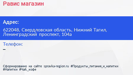 Равис, магазин по адресу 622048, Свердловская область, Нижний Тагил, Ленинградский проспект, 104а в дальнейшем Организация, размещена в следующих категориях: