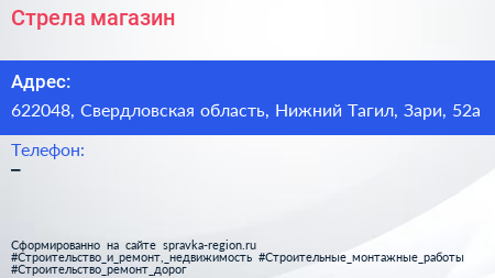 Стрела, магазин по адресу 622048, Свердловская область, Нижний Тагил, Зари, 52а в дальнейшем Организация, размещена в следующих категориях:
