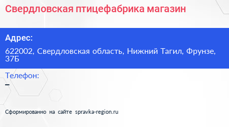 Свердловская птицефабрика, магазин по адресу 622002, Свердловская область, Нижний Тагил, Фрунзе, 37Б в дальнейшем Организация, размещена в следующих категориях: